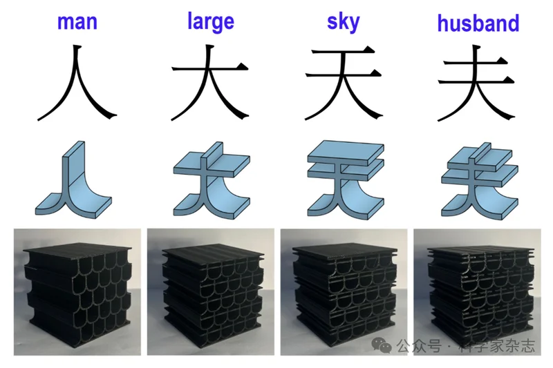 研究人员选取了四个结构相近、逐级演化的简单汉字来验证其材料构型的有效性。第一个是“人”,其形状类似一个收敛的倒‘V’结构;“大”是在“人”的基础上增加一条水平笔画;“天”则在“大”的上方再增加一条水平笔画;最后,“夫”与“天”类似,但其最上方横画略短且与顶部存在偏移。