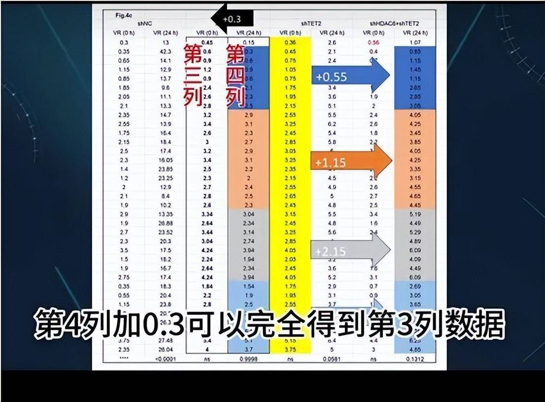 最为直观的异常出现在Figure 4c中。该表格共有8列数据,其中第三列与第四列之间存在固定的数值关系,第四列数据加上0.3,恰好等于第三列。
