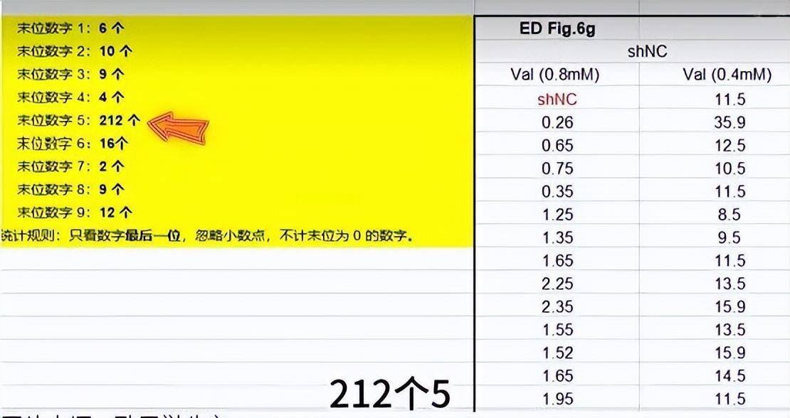 对于论文中其他数据存疑的地方,耿同学还举例道,Figure 6g表格的末尾数字中,“5”出现了212次,而其他数字出现频率最高的是数字“6”,仅有16次;另一组共2400个数据中,末尾数字“5”的出现频率也畸高,不符合随机分布规律。他还提到,196只小鼠的体重数据中,只有1只的末位数字是0——“小鼠是活的,它会动,秤上的克数会浮动,精确到0.01克本就很难,末位数字应该是随机分布的,但这组数据几乎全是非零数字。”