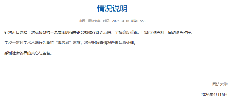 红星新闻此前报道,记者致电王某论文发表时任职且注明的隶属机构同济大学某学院,工作人员表示其已调离。