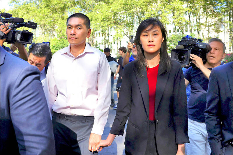 涉嫌非法充当中国代理人而被捕与被控多项罪名的前纽约州州长侯可的副幕僚长孙雯(右),及其夫婿胡骁(左)。 (路透文件照)