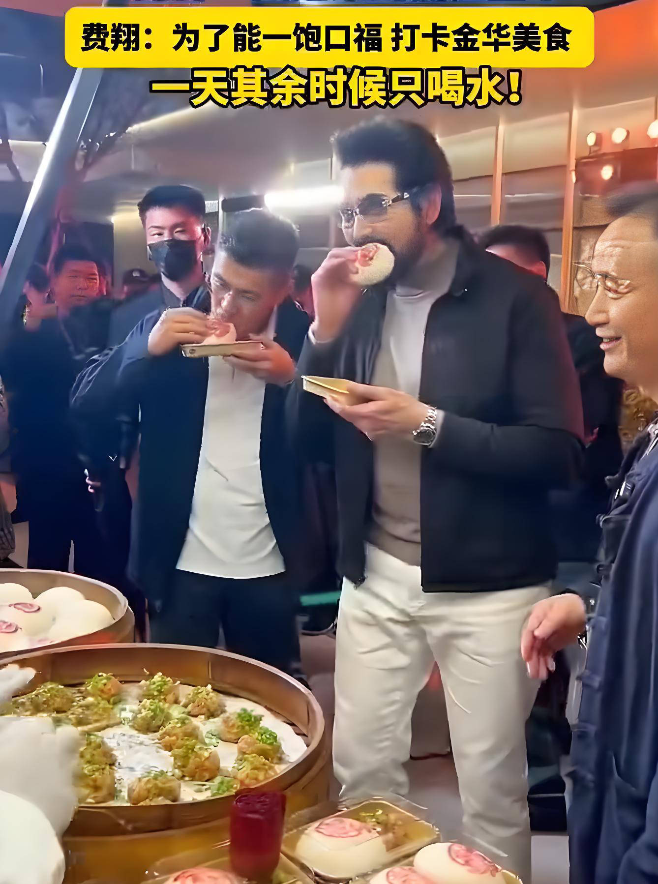 费翔在金华美食街上大快朵颐,他吃清明稞、谢家馄饨、汤圆。他边吃边说:饿了一天,终于等到这一顿了。