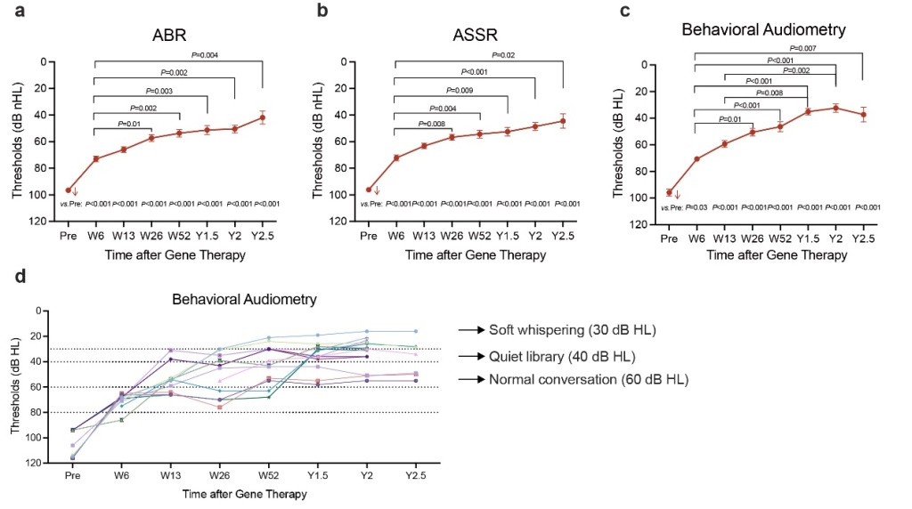 临床数据显示,90%的患者在治疗后成功恢复听力,并且听力水平呈现持续、稳定的提升趋势。患者听觉脑干反应(ABR)的平均阈值从给药前的>97 dB nHL逐步改善至治疗后2.5年时的42 dB nHL,多频稳态诱发电位(ASSR)阈值从给药前的>96 dB nHL改善至2.5年时的44 dB nHL,行为测听阈值从给药前的>96 dB HL改善至2.5年时的37 dB HL。长期随访达2.5年的患者中,100%有效患者的听力水平恢复到能听清日常交谈,57%可识别图书馆级别的轻微背景音,43%能听见耳语。