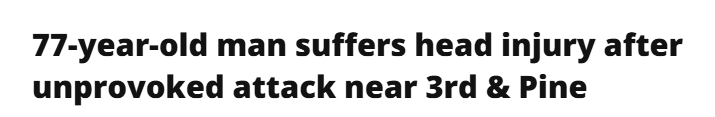 据报道,4月19日晚上9点50分左右,西雅图治安痼疾路口——3rd街与Pine街附近,再次发生了一起无端袭击案件。一名77岁的老人在路边行走时,被两名陌生男子无预警地袭击,导致其头部受伤,手臂疑似骨折,鲜血染红了人行道。