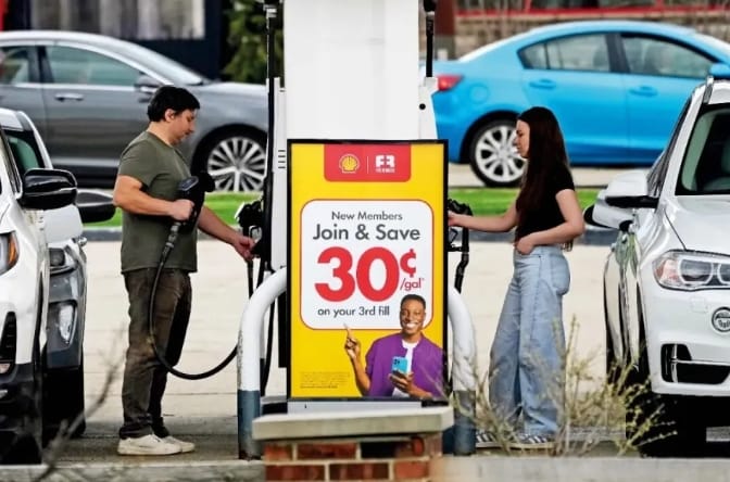 受到霍尔木兹海峡封锁影响,全球油价大涨,图为当地时间4月15日,美国伊利诺州的一处加油站,民众在位车辆自助加油。