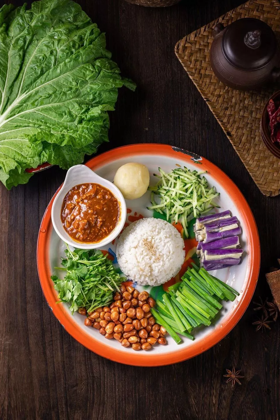 把米饭换成双倍土豆泥,和茄子一起蒸熟,捣烂成泥,再配上花生米、小葱、少油版的东北鸡蛋酱,用生菜叶包着吃。