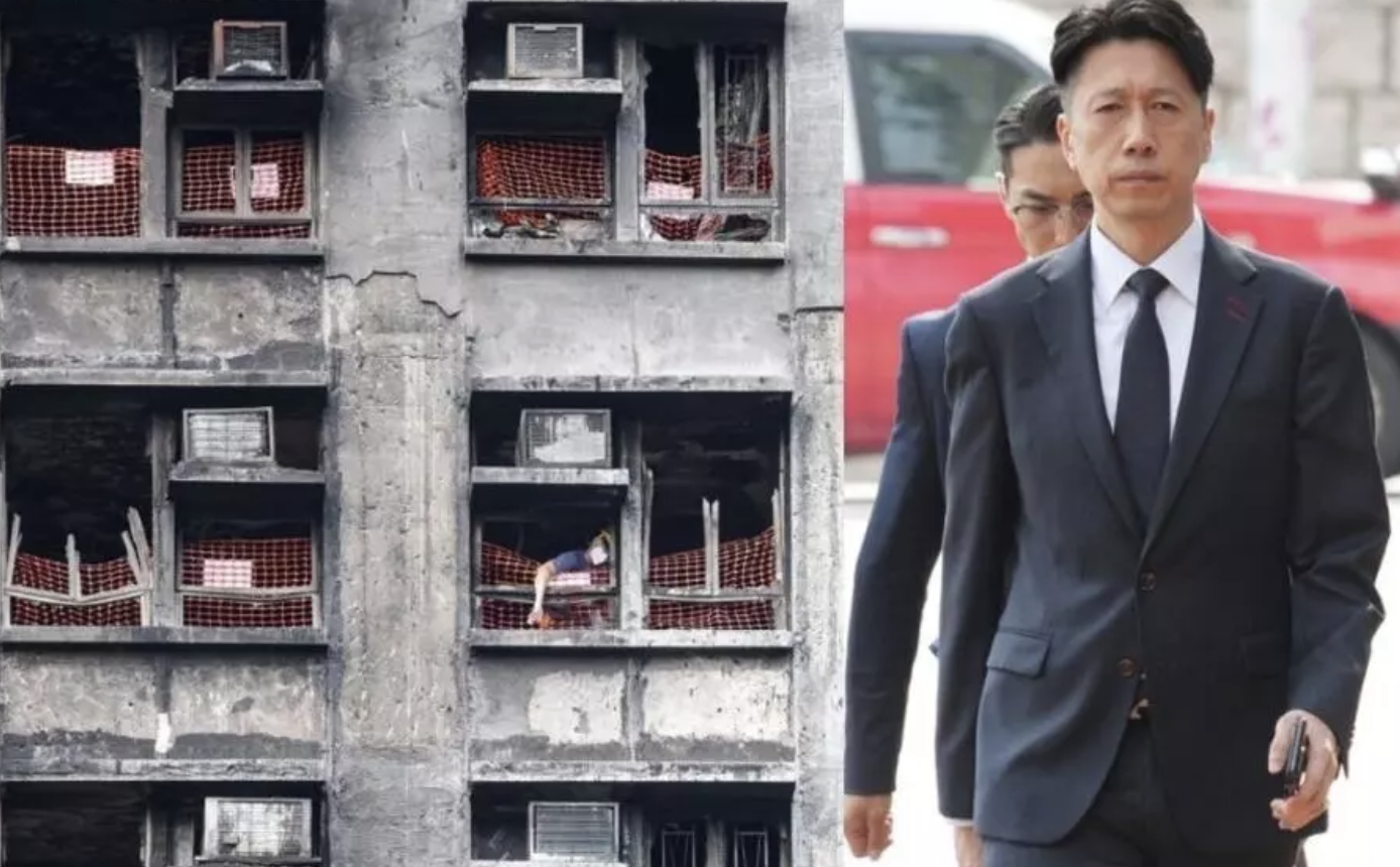 在宏福苑火灾居民回家执拾物品(图左)之时,翁锦雄(图右)以消防处高层身份在大火听证会上作供 ,指工人吸烟等火警风险事宜,均非消防职责范围的说法,惹来非议和批评。 © 麦燕庭提供