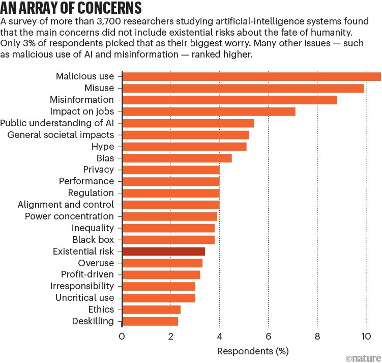 更值得关注的是:一项今年三月的预印本研究调查了约4000名AI研究人员,问他们"最担心AI的哪一件事",结果只有3%的人回答是灭绝性风险,位列所有关切项目的末尾。排名靠前的是恶意使用、信息误导和大规模监控,这些是已经正在发生的伤害。