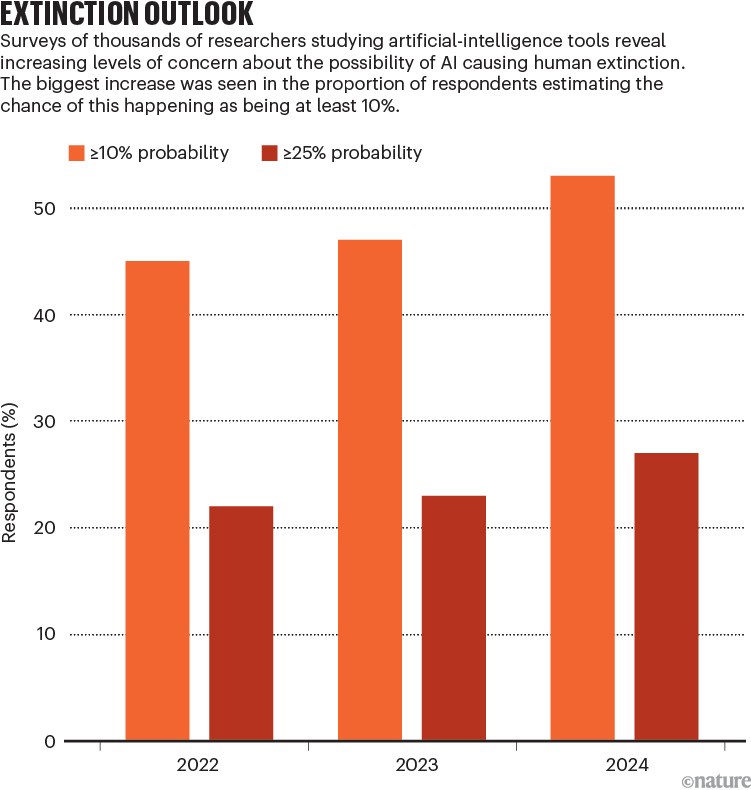 伯克利AI Impacts项目联合创始人卡佳·格雷斯追踪了多年来AI研究人员对灭绝风险的估计,数据显示认为AI有10%或以上概率导致人类灭绝的受访者比例,在2022年至2024年间持续上升。约翰斯·霍普金斯大学AI治理研究员吉莲·哈德菲尔德坦言:"我自己从来不是末日主义者,但近几个月我确实感到相当紧张。"