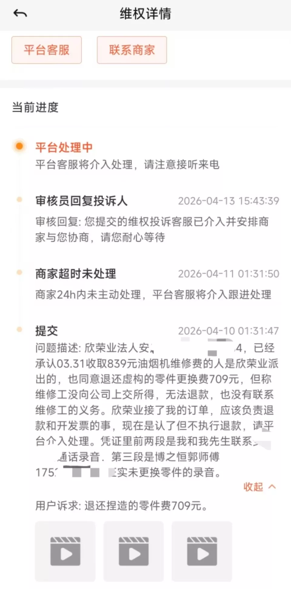 在平台上的“维权投诉中心”,却找到了另外一个订单。受访者提供