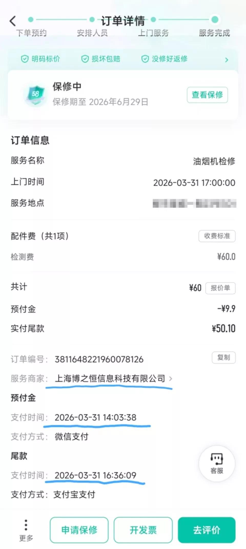 沈女士告诉记者,3月31日下午2点多,她在58同城APP下单,给住在闵行区的父母维修油烟机,在平台上“询问报价”后,她下了个订单。在她账号“我的订单”中,该订单的服务商家为:上海博之恒信息科技有限公司,检测费约60元,预付款9.9元。