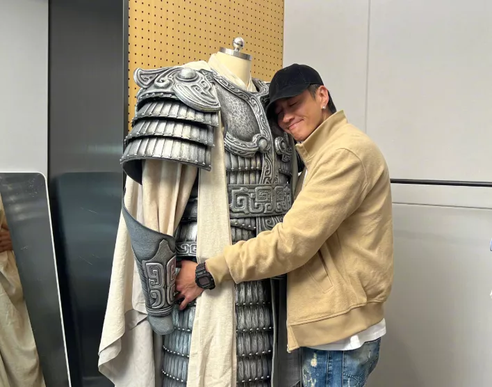 但何润东身高186cm,一身的腱子肉,壮硕魁梧,这铠甲简直就是为他量身打造,穿上后立马就有了“力拔山兮气盖世”的压迫感。