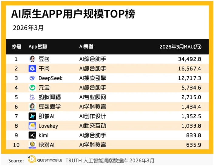 更值得一提的是字节跳动,豆包跻身AI原生App活跃用户榜首,日均Token消耗量国内第一、世界第三①;Seedance成为AI视频生成行业标杆,性能在权威测评中屡屡登顶。