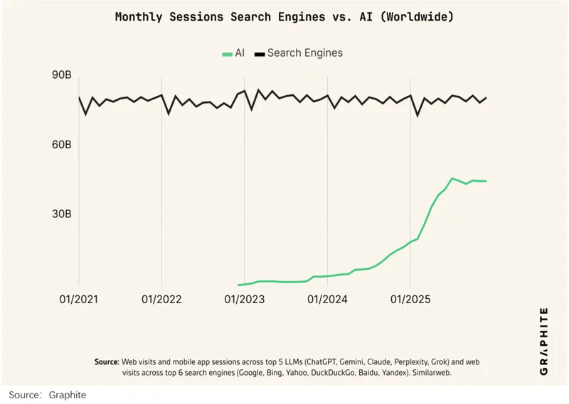 一份最新研究,对比了TOP5生成式AI与TOP6搜索引擎,发现AI访问量已达到全球搜索规模的56%。在60岁老头都会用AI的国内,人们甚至连搜八卦“吃瓜”都开始依赖AI。②