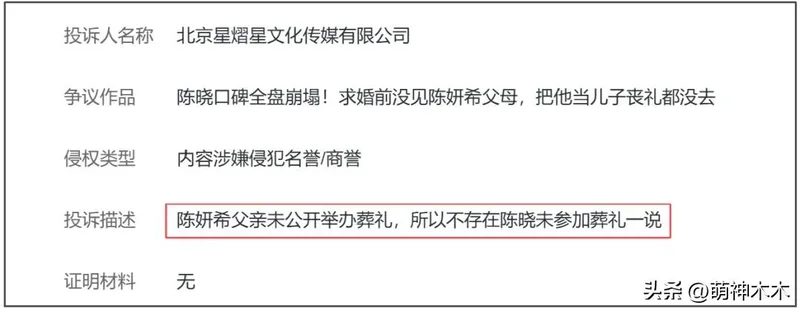 相较之下,陈晓新剧表现不佳,在婚姻中没有担当的行为也惹来争议,陷入负面风波。如今为了反击,陈晓方面投诉大量相关稿件,投诉理由也间接披露了一些真实情况。比如陈晓未出席陈妍希父亲丧礼的事情,他给的侵权理由是“陈妍希父亲未公开举办葬礼,所以不存在陈晓未参加葬礼一说”。