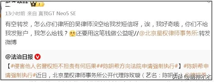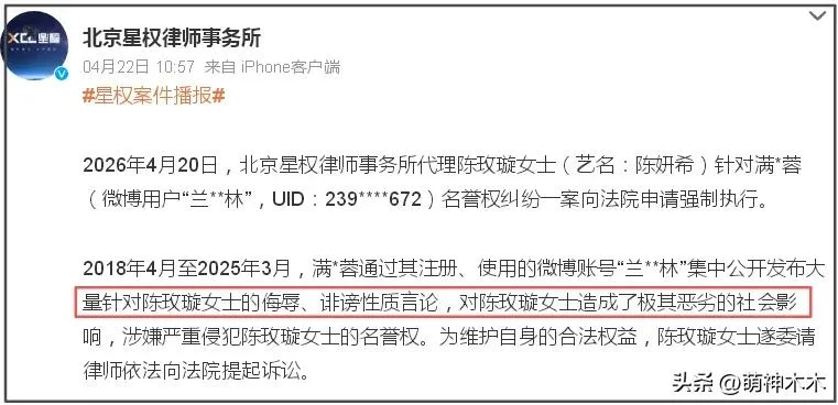 律师声明称黑粉针对陈妍希进行了长达7年的抹黑造谣,在2018年至2025年期间发布了大量侮辱诽谤言论。陈妍希维权胜诉后要求对方赔偿4万并置顶道歉声明,因对方未履行判决责任已向法院申请了强制执行。