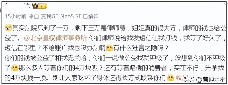 而后,黑粉被全网通报后还发文挑衅陈妍希及其律师,声称赔偿只有一万,其余三万是律师费,并控诉陈妍希律师为何不发转账账户无法给钱。同时,还晒出陈妍希卖假货保养品及客户要求赔偿的截图,喊话陈妍希速速赔偿。