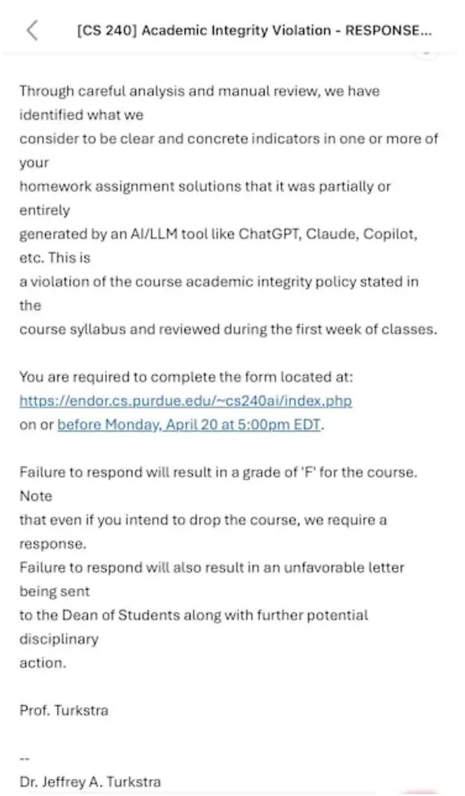 学期末,授课教授 Jeffrey Turkstra 突然给班上两百多名学生群发了一封邮件,内容简单粗暴:系统检测到你们的作业存在 AI 使用痕迹,这属于作弊。所有人必须填写表格主动交代,否则直接挂科,并上报教务长处理。