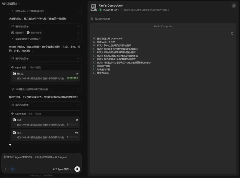 过去丢给Kimi一个复杂任务,它一个人从头干到尾,遇到不擅长的环节就可能卡住。现在它会自己拆活、组队、分头干,每个子Agent专攻自己擅长的那块,最后汇总交付。