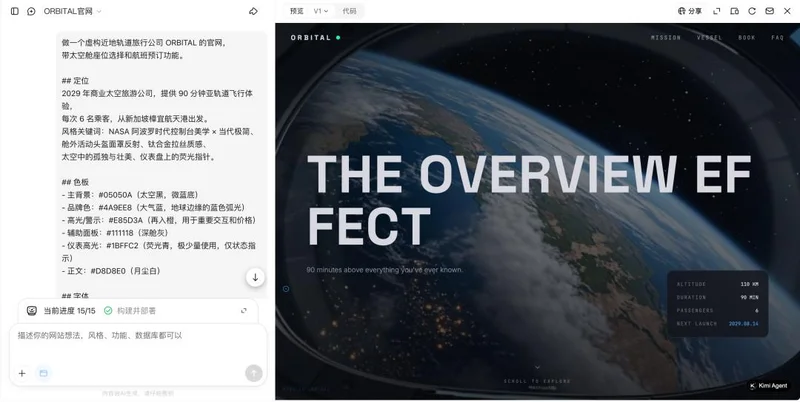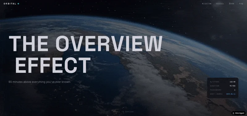 首先,让K2.6 Agent制作一个近地轨道旅行公司ORBITAL的官网,要求植入太空舱座位选择和航班预订功能。