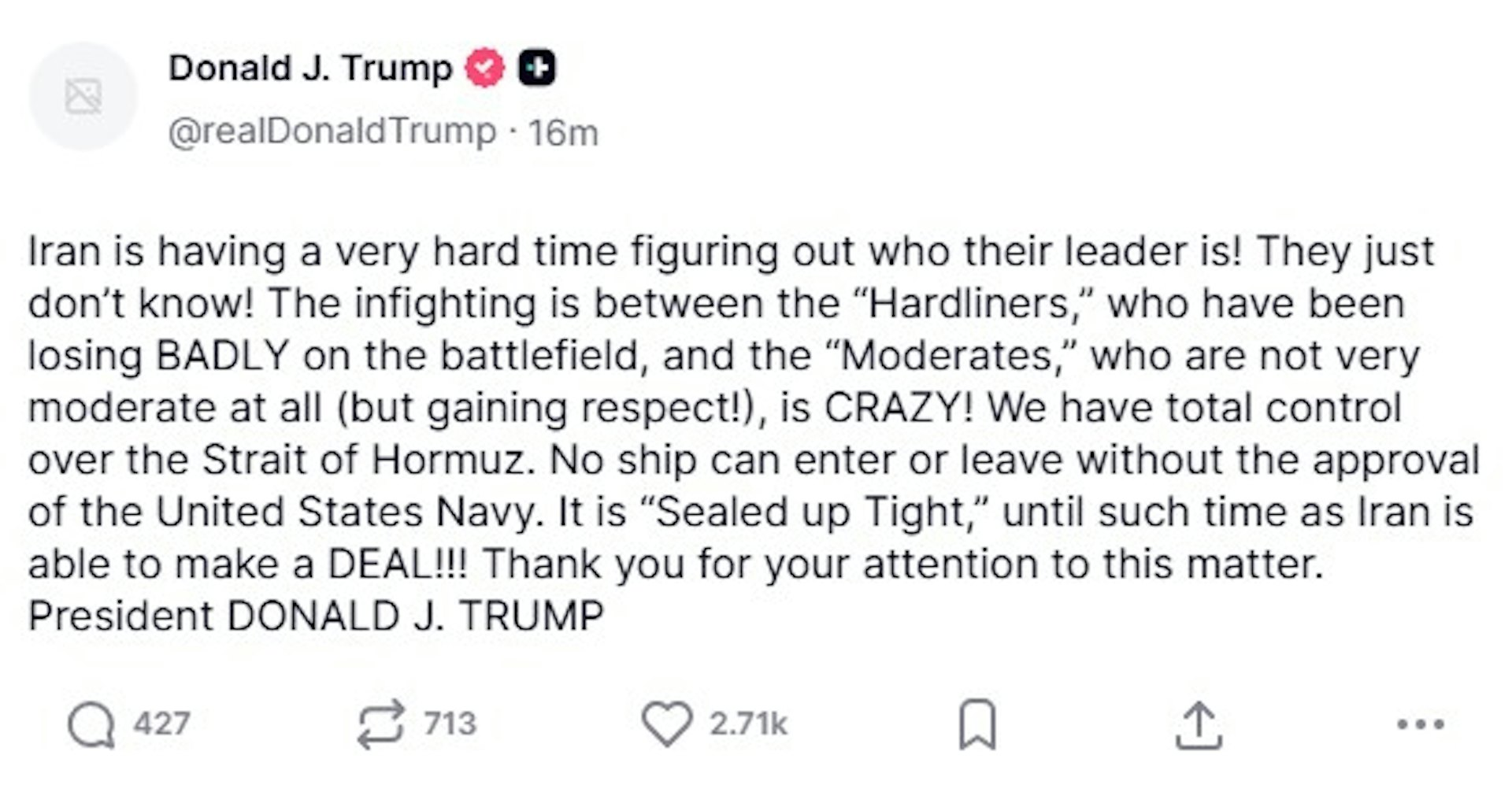 特朗普之后又发文称,伊朗为谁是他们的领导人而伤透脑筋,「他们根本就不知道!内部权力斗争疯狂,一方是强硬派,在战场上遭遇惨败,另一方是温和派,虽然他们其实一点也不温和(但赢得尊重)。我们已完全控制霍尔木兹海峡,未经美国海军批准,任何船只都无法进出海峡。海峡已被彻底封锁,直至伊朗愿意达成协议为止! ! !」