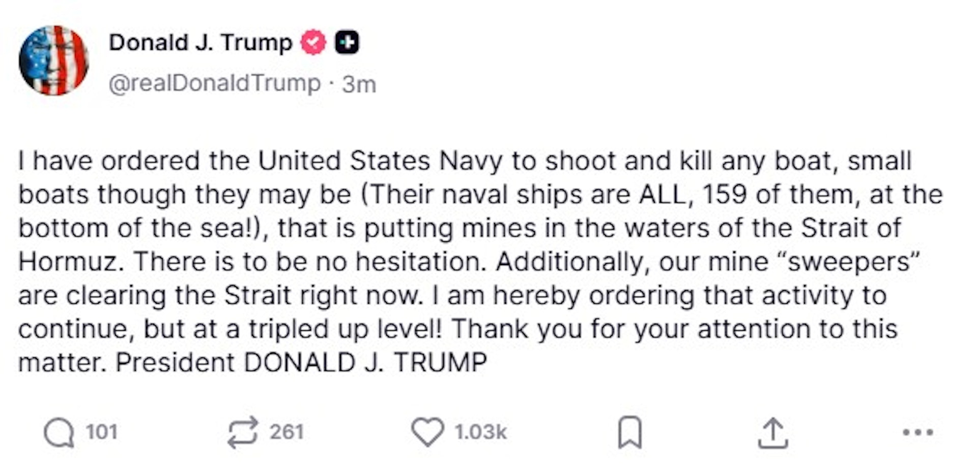 特朗普在社交网站发文称「我已下令美国海军,对于任何在霍尔木兹海峡水域布设水雷的船只,就算它们只是小型船只,一律予以开火击沉(毕竟,他们的所有军舰共159艘,已全部沉入海底!)。」他又指不会犹豫。