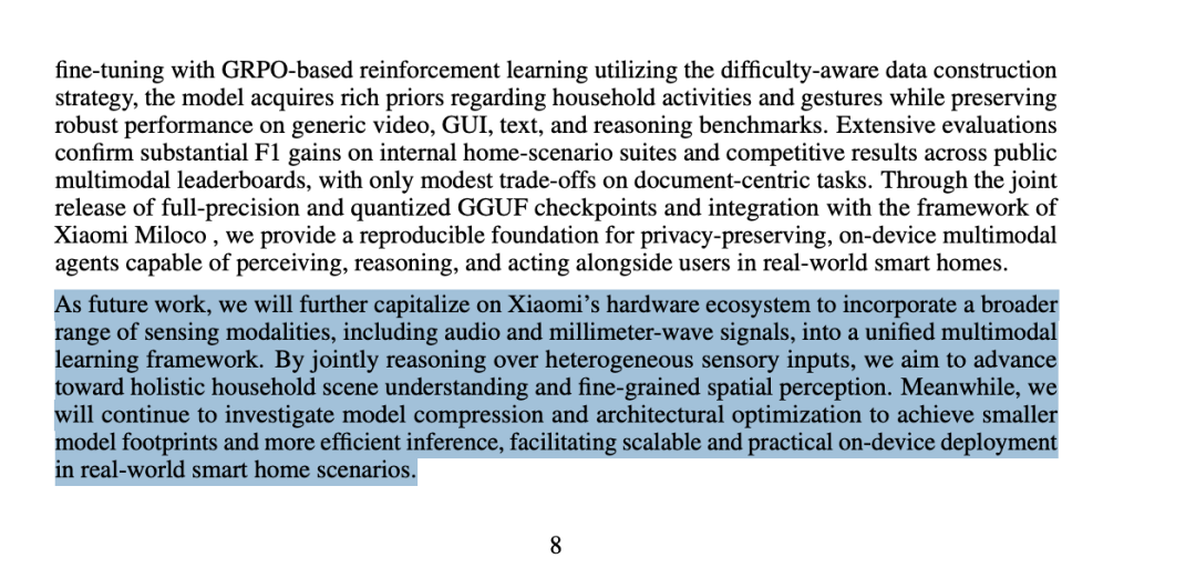 早在小米2025年12月发表的一篇名为《Xiaomi MiMo-VL-Miloco Technical Report》的文章中就明确指出:未来,小米将进一步依托其硬件生态,将音频、毫米波信号等更多感知模态纳入统一的多模态学习框架。通过对多类异构感知输入进行联合推理,最终实现全方位的家居场景理解与精细化空间感知。