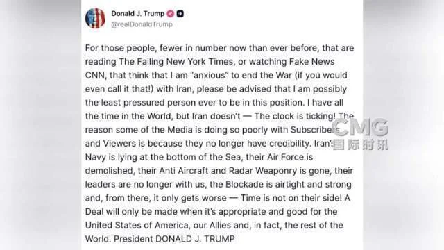 美东时间4月23日下午,美国总统特朗普又在社交媒体发帖称,他“并不急于结束与伊朗的战争”,可是“伊朗没时间了”。特朗普在帖文中再称《纽约时报》和美国有线电视新闻网(CNN)为“假新闻(媒体)”,称看这些“假新闻”的人认为他“急于结束与伊朗的战争”,但他“可能是身处这个位置上压力最小的人了”。特朗普称,“我有的是时间,但伊朗没有——时钟正在滴答作响!时间不在他们那边!而协议只有当对美国及其盟友有利时才会达成。”