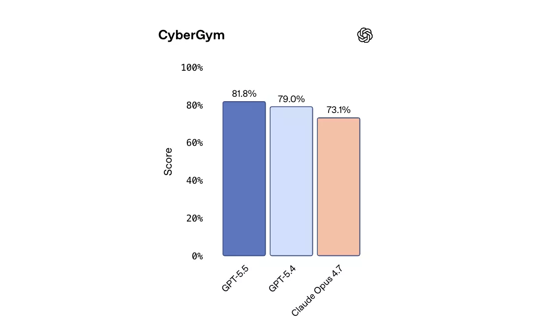 在网络安全基准CyberGym上,GPT-5.5得分81.8%,高于GPT-5.4的79.0%及Claude Opus 4.7的73.1%。
