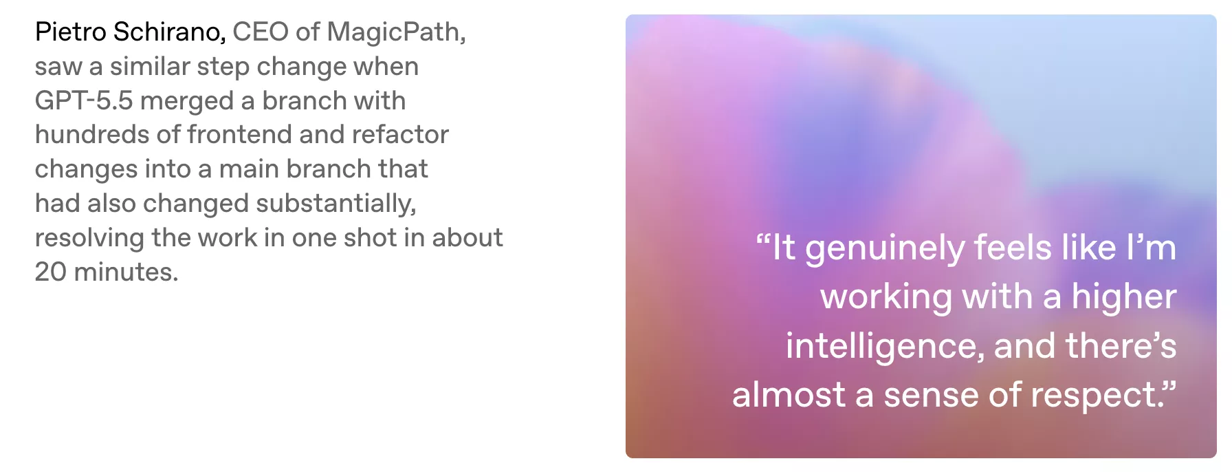 MagicPath CEO Pietro Schirano指出,GPT-5.5在约20分钟内一次性完成了一次涵盖数百项前端改动与重构更改的分支合并任务。其直言:“感觉就像是在和更高层次的智慧生物一起工作,甚至会产生一种敬畏之情。”