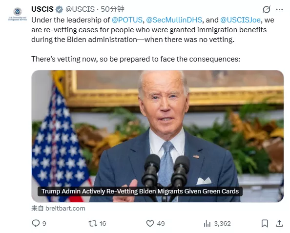 这一表态标志着移民局的重大转向!在拜登时期,移民局充当一个福利机构的角色,审查相当轻松。而在川普时代,移民局已经转型为执法机构的角色,其下属的“欺诈检测和国家安全局”(Fraud Detection and National Security Directorate)正在成为最重要的机构。