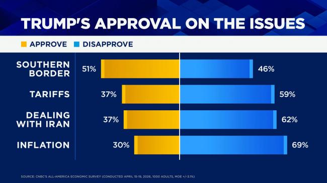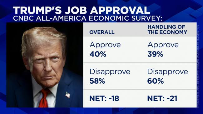 当前经济支持率为39%支持、60%不支持,相较上一季度的43%对54%进一步走弱,其净支持率降至-21,成为CNBC调查中其任内最低水平。