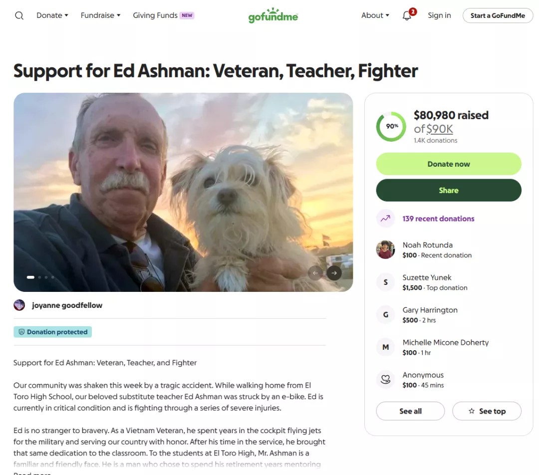 社区迅速行动起来支持这位老兵教师,一个名为“Support for Ed Ashman: Veteran, Teacher, Fighter”的GoFundMe页面已上线,组织者表示,捐款将用于支付他的医疗护理、长期康复费用,以及在他病情危重期间对其家人的支持。