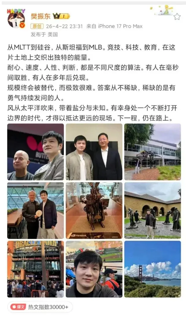 乒乓球奥运冠军、大满贯得主樊振东近日现身美国,以美国职业乒乓球大联盟Major League Table Tennis战略投资人的身份参与相关活动,并展开一系列科技企业参访行程,引发外界关注。