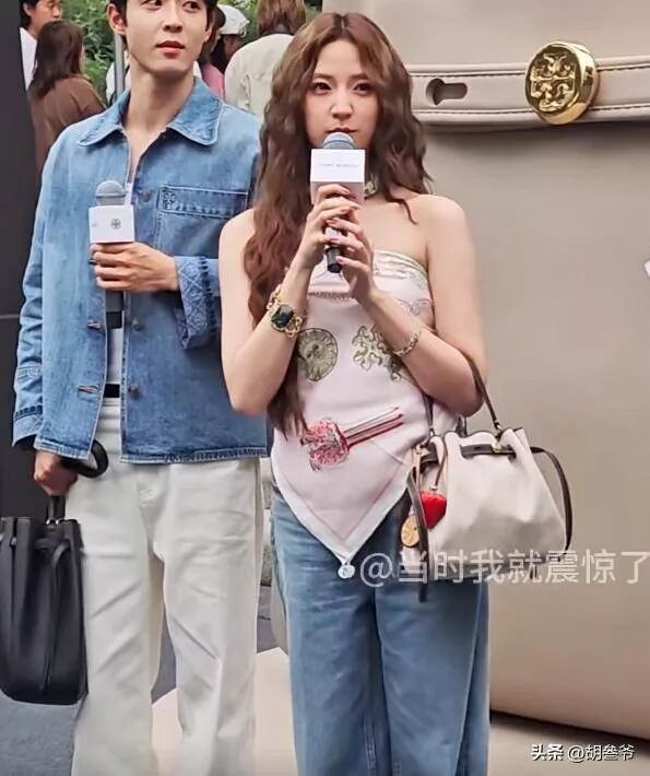 她当天选的搭配实在让人看不懂,上半身是一件印花裹胸上衣,图案是复古风,可颜色暗沉,完全不衬肤色。