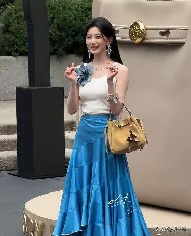 这条蓝裙比较贴身,把她的小缺点全抖出来了,小肚子上的赘肉清晰可见,手臂上的肉肉也很抢镜,膀大腰圆的麒麟臂格外明显。