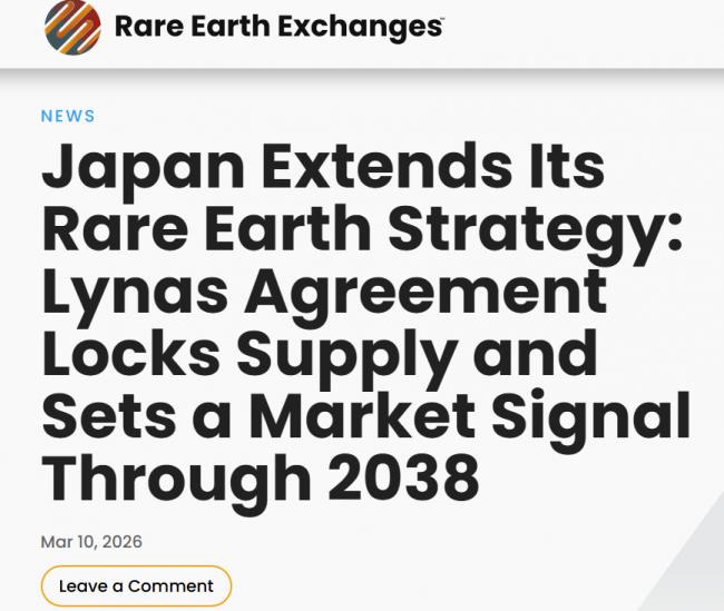 3月10日,日本金属与能源安全保护机构(JOGMEC)旗下的JARE公司与莱纳斯达成了一项长期供应协议,协议至2038年,规定以不低于每公斤110美元的价格,每年向莱纳斯采购5,000吨钕镨(NdPr)氧化物,以及莱纳斯生产的重质稀土产量的75%。协议涵盖的稀土氧化物采购总量预计每年超过7,200吨。