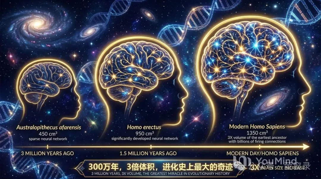 大脑在 300 万年体积增加 3 倍,就是进化史上最大的奇迹。不然的话,我们今天的世界应该就是一个原始的世界,看不到什么科技摩天大楼,完全没有。我们就跟猴子一样,我们就跟猫一样,快快乐乐的来到这个世界,莫名其妙的死掉。这个世界就是一个没有意义的世界。因为我们有了智能,这个世界才有意义。
