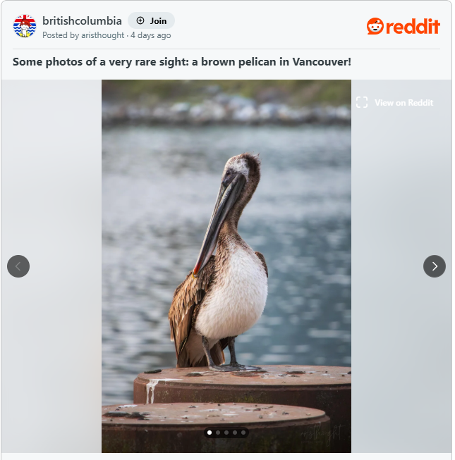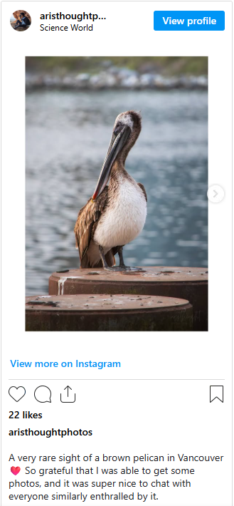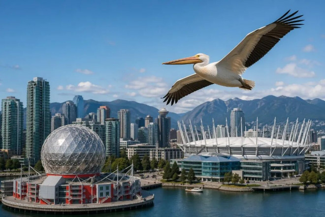 根据媒体dailyhive的报道,摄影师兼艺术家Jake上周在社交媒体分享了多张照片,记录下这只褐鹈鹕飞越Science World和Rogers Arena附近的画面。