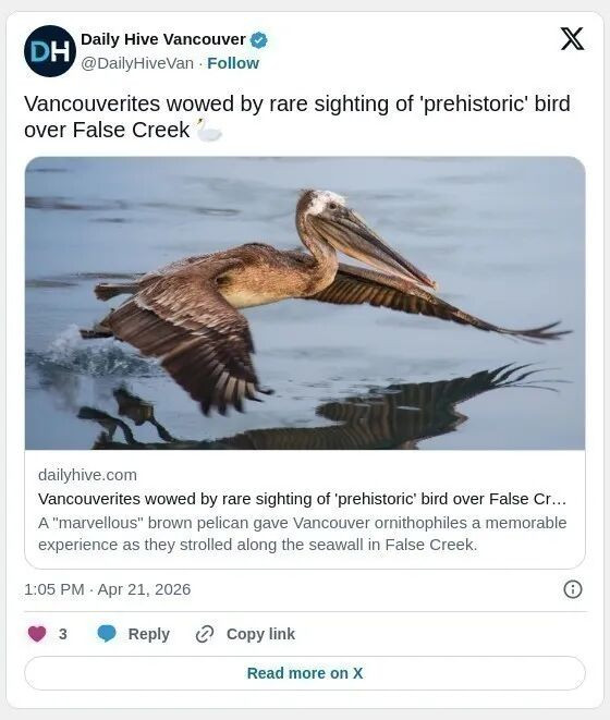近日,一只罕见的褐色鹈鹕(pelican)现身温哥华福溪(False Creek)一带,在海堤上空盘旋飞行,吸引大量市民驻足观看,成为当地一大惊喜景象。