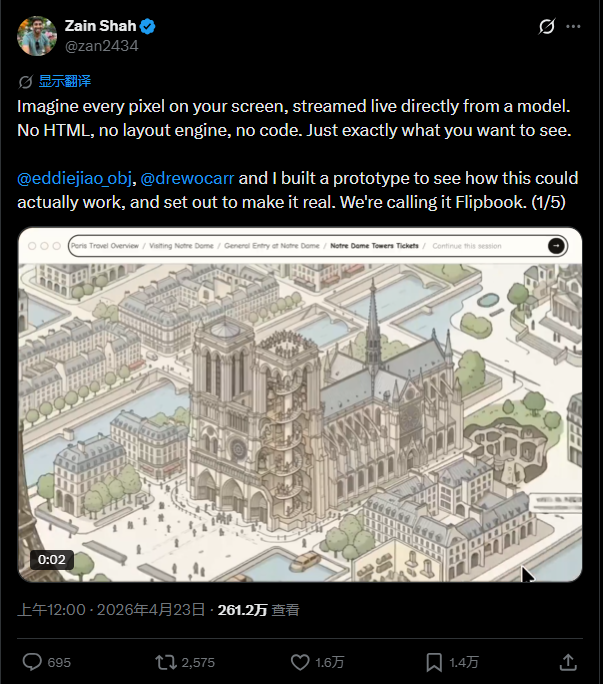这就是 Zain Shah(前 OpenAI、YC 校友)和团队刚刚发布的 Flipbook 原型。
