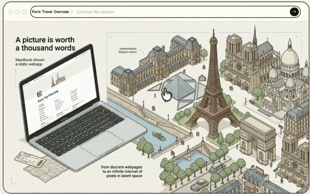 它能瞬间理解你的意图,动态重塑整个界面——从巴黎旅行规划到复杂数据可视化,全是手绘级插图般生动,还能随点击无缝变形、交互。