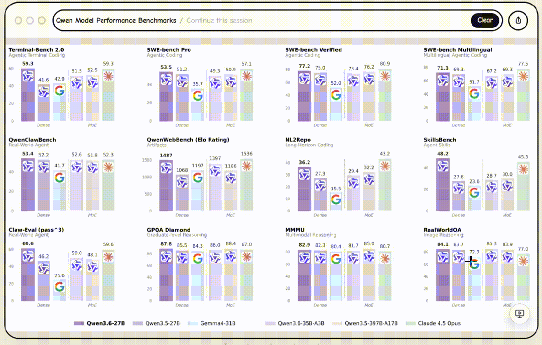 例如:今天Qwen3.6-27B 模型发布了,之前总要仔细看下各项基准评分的对比,现在我直接交给 Flipbook 帮我解读了。