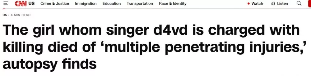这起案件与美国歌手d4vd(本名大卫·伯克)有关。检方指控,他涉嫌杀害这名少女,并对遗体进行肢解和处理。目前,他已被控一级谋杀、性侵未成年人及毁尸等多项罪名,但本人已否认所有指控。