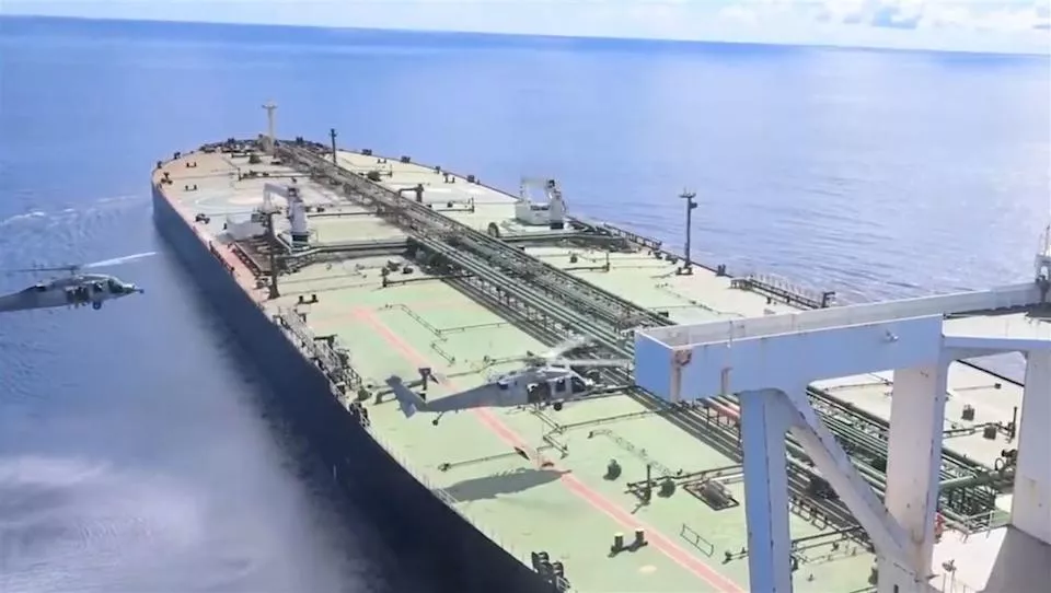 美军在印度洋扣押一艘无国籍油轮“雄伟X号”(Majestic X),美军士兵从直升机上“空中吊挂登船搜查”。(图/美国战争部X平台)