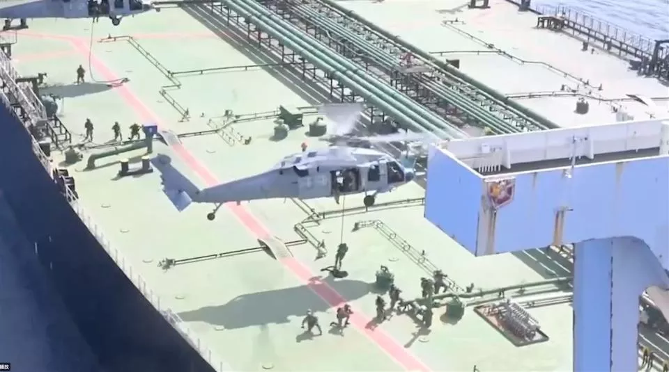 从画面中可以看到,美军直接在直升机上、从半空中吊挂垂降登船,对“雄伟X号”进行搜查,画面曝光引发热议。