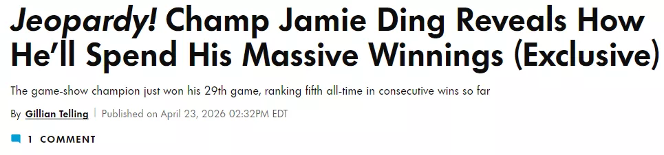 这一次站在聚光灯下的还是Jamie Ding。在最新一集播出的 Jeopardy! 节目中,他再次轻松拿下一场胜利,把自己的连胜场次刷新到了第29场,同时也把个人累计奖金推高到了793,602美元;单场比赛中,他又收入19,001美元,这样的节奏,已经不再是“赢一场比赛”,而更像是在稳定地拉开差距。