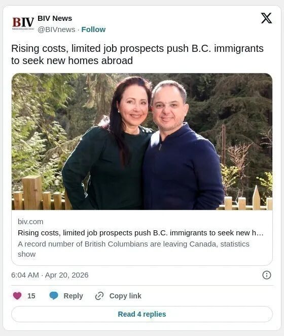 加拿大统计局数据显示,2025年约有30,612名BC居民离开加拿大,占全国移民外流总量的25%以上,而BC人口仅占全国约13%。