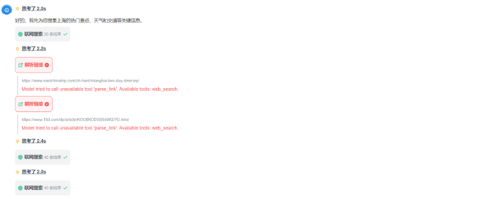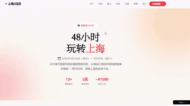 不过,这样简单的编程题目已经难不住DeepSeek-V4-Pro,我们试着让它完成一个结合Agent能力与编程的任务:规划一次去上海的旅行,然后把所有相关信息整合为一个旅行网站,附上对应的景点定位。