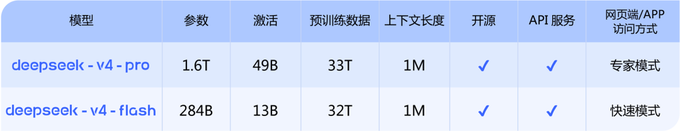 本次发布包含两款模型:DeepSeek-V4-Pro与DeepSeek-V4-Flash,分别采用MoE架构,总参数规模达到1.6T(激活49B)与284B(激活13B),并统一支持最长100万token上下文。